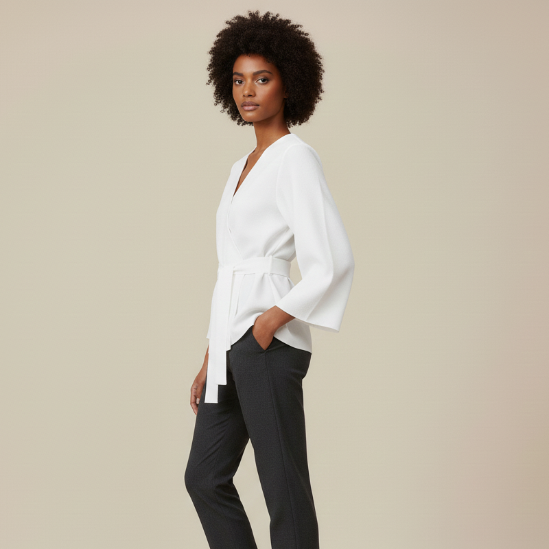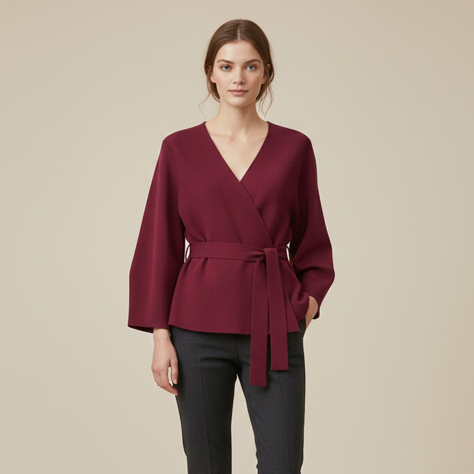 Featuring a flattering V-neckline, elegant wide sleeves, and an adjustable waist tie, it is designed to complement your natural shape while providing maximum freedom of movement. Whether paired with tailored trousers for the office or denim for a relaxed weekend, this cardigan is the ultimate versatile staple for the modern woman who values both style and substance.